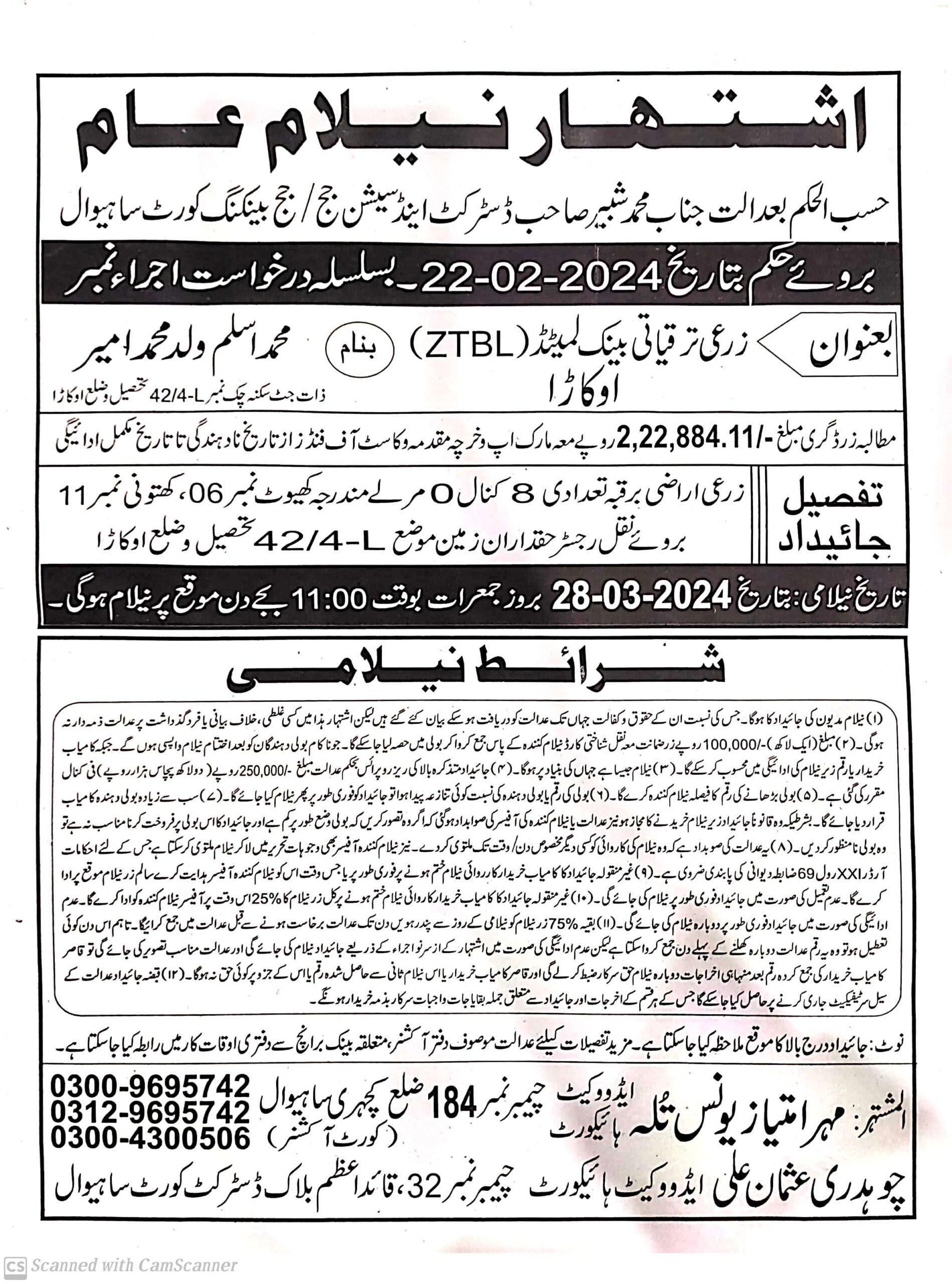 136. ZTBL بہاولنگر برانچ بمقابلہ میاں نثار احمد S/O میاں نصیر احمد [13 مئی 2024]