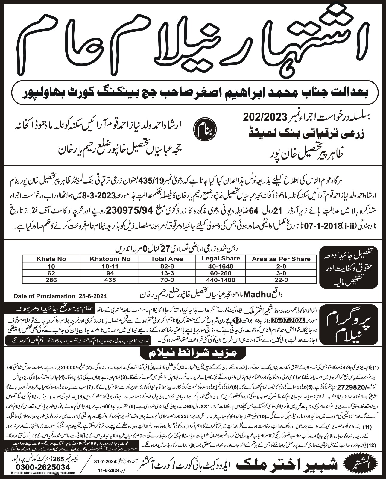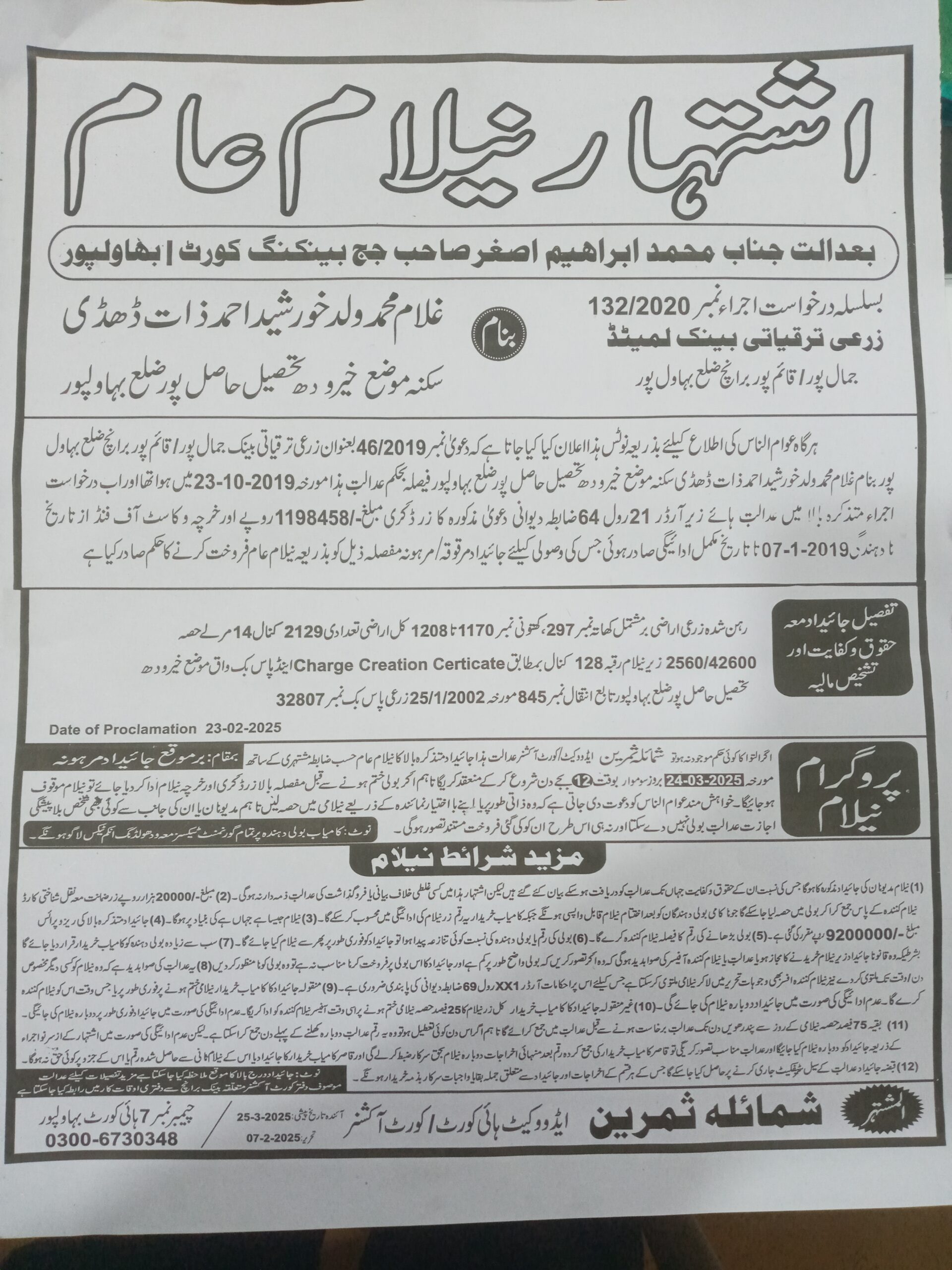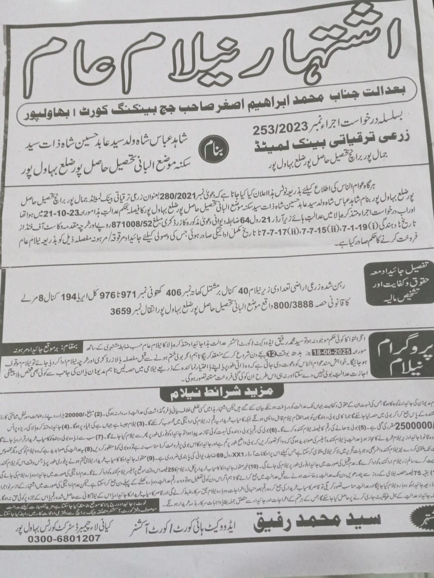 20. ZTBL قائم پور برانچ بمقابلہ شاہد عباس ولد سید عابد حسین شاہ، پھانسی نمبر 253/2023 [18-جون-2025، بدھ 12.00 بجے]