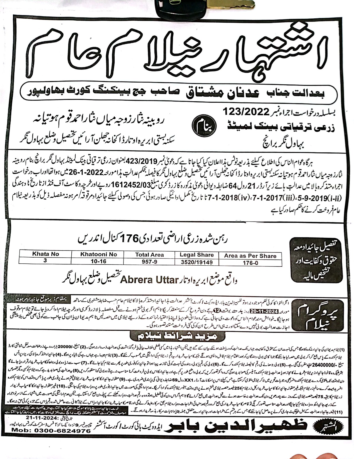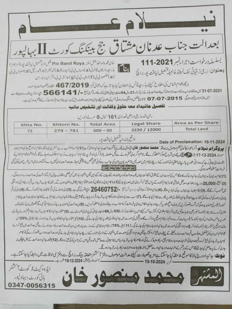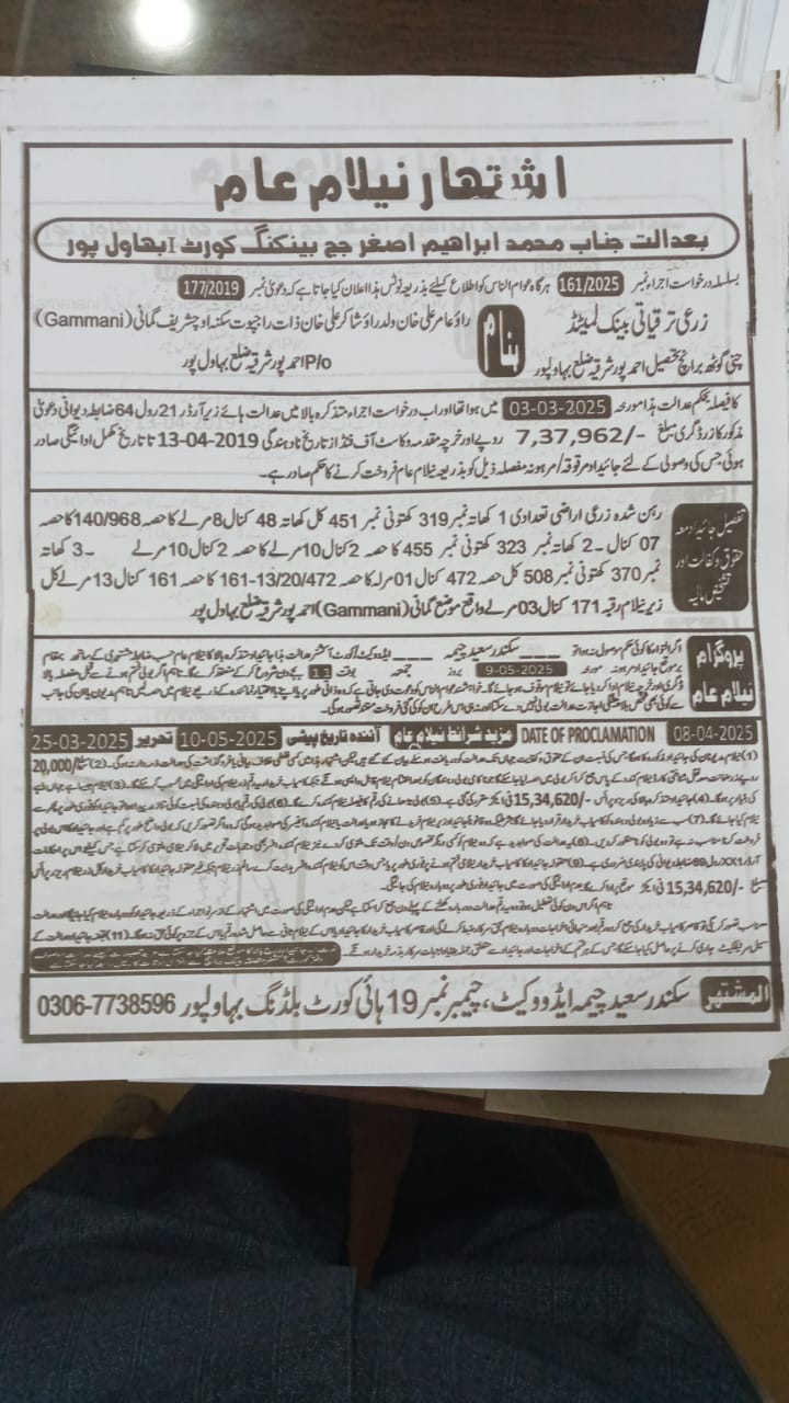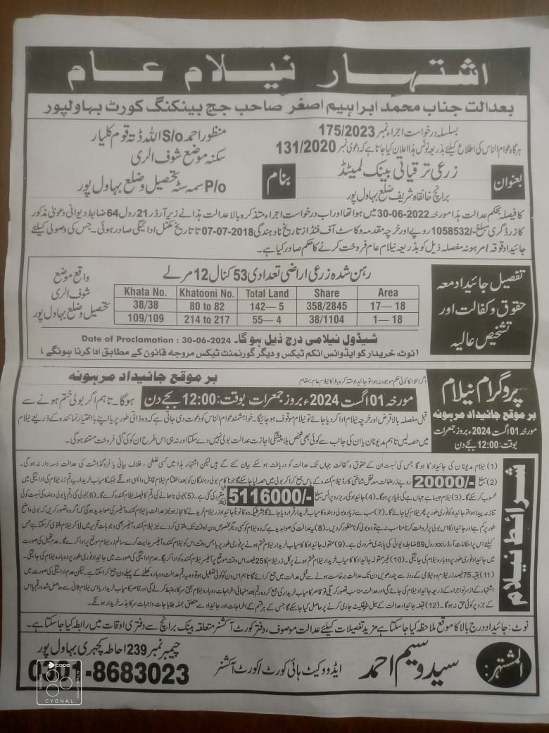 131. نیلامی-ماروٹ برانچ-بہاولنگر ریجن-ZTBL بمقابلہ محترمہ شمیم ​​اختر W/O میاں اللہ یار مموکا [27مئی2024]