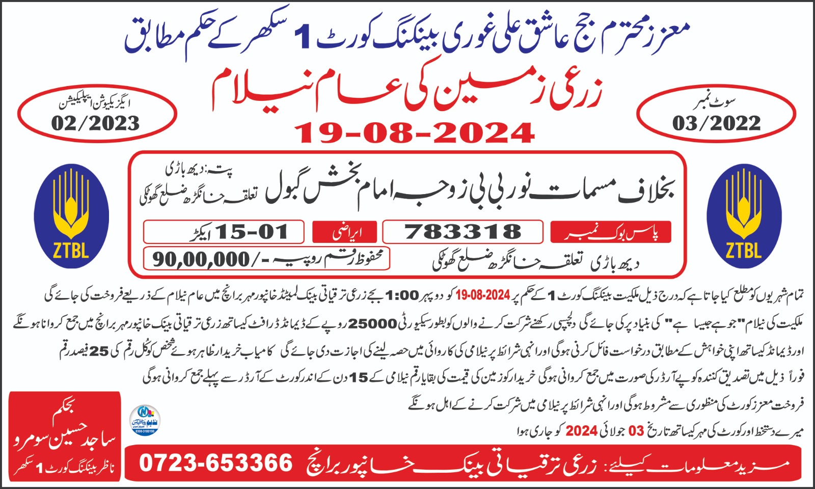 17. ZTBL چنی گوٹھ برانچ بمقابلہ بخت علی اور رشیدہ بی بی، پھانسی نمبر 217/2023 [21-اگست-2025، جمعرات صبح 11.00 بجے]