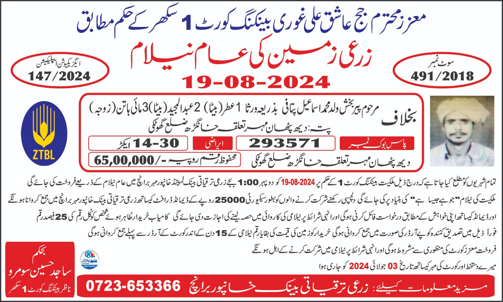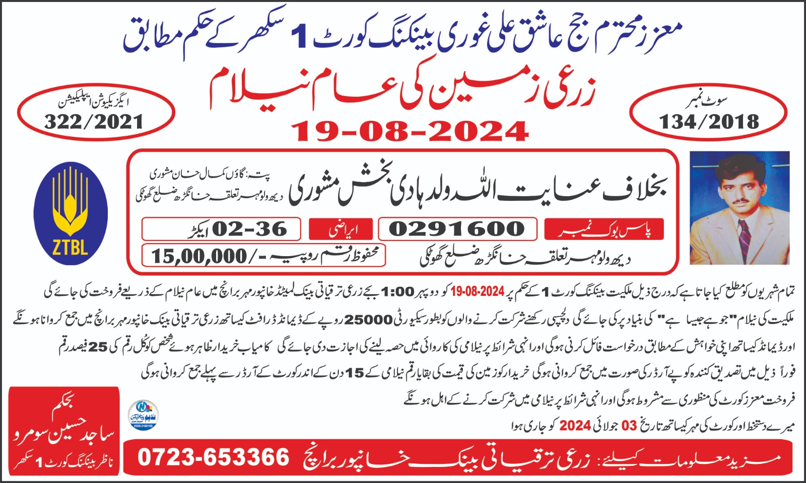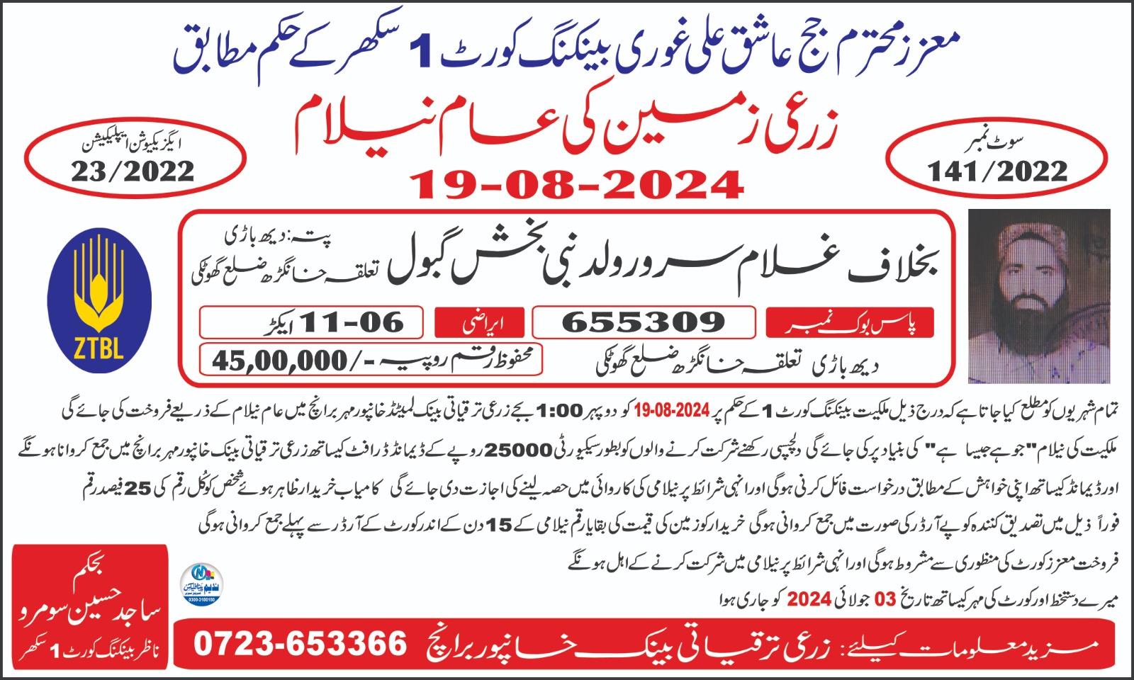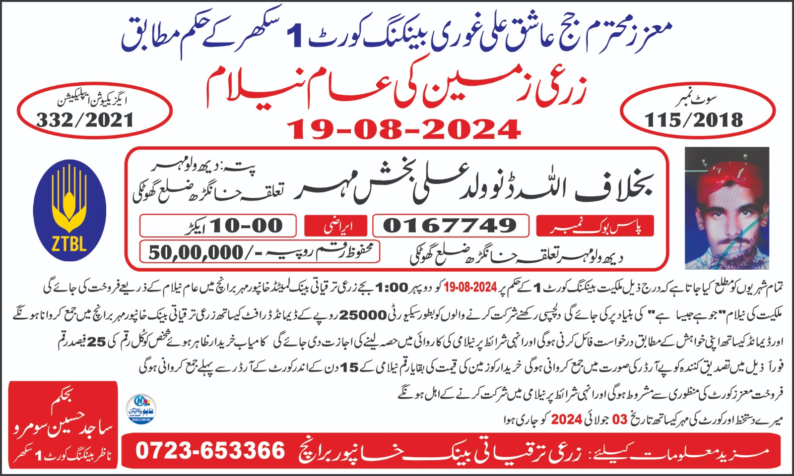 118. ZTBL خیرپور تامیوالی برانچ بمقابلہ مشتاق احمد ولد احمد شیر [05-جولائی-2024، پیر 12.00 بجے]