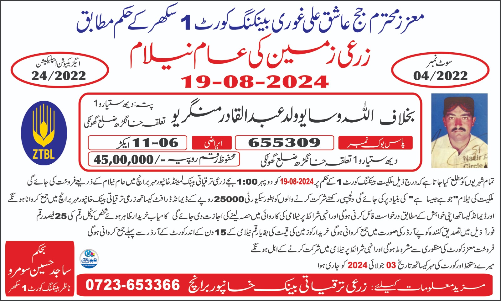 114. ZTBL سنجر پور برانچ بمقابلہ مطیع اللہ اور اعجاز احمد ولد محمد نواز [19-جولائی-2024]