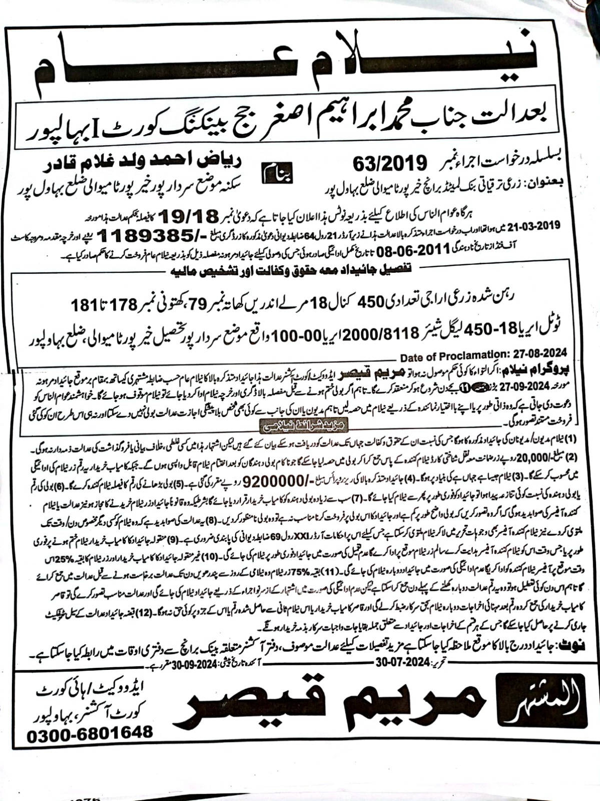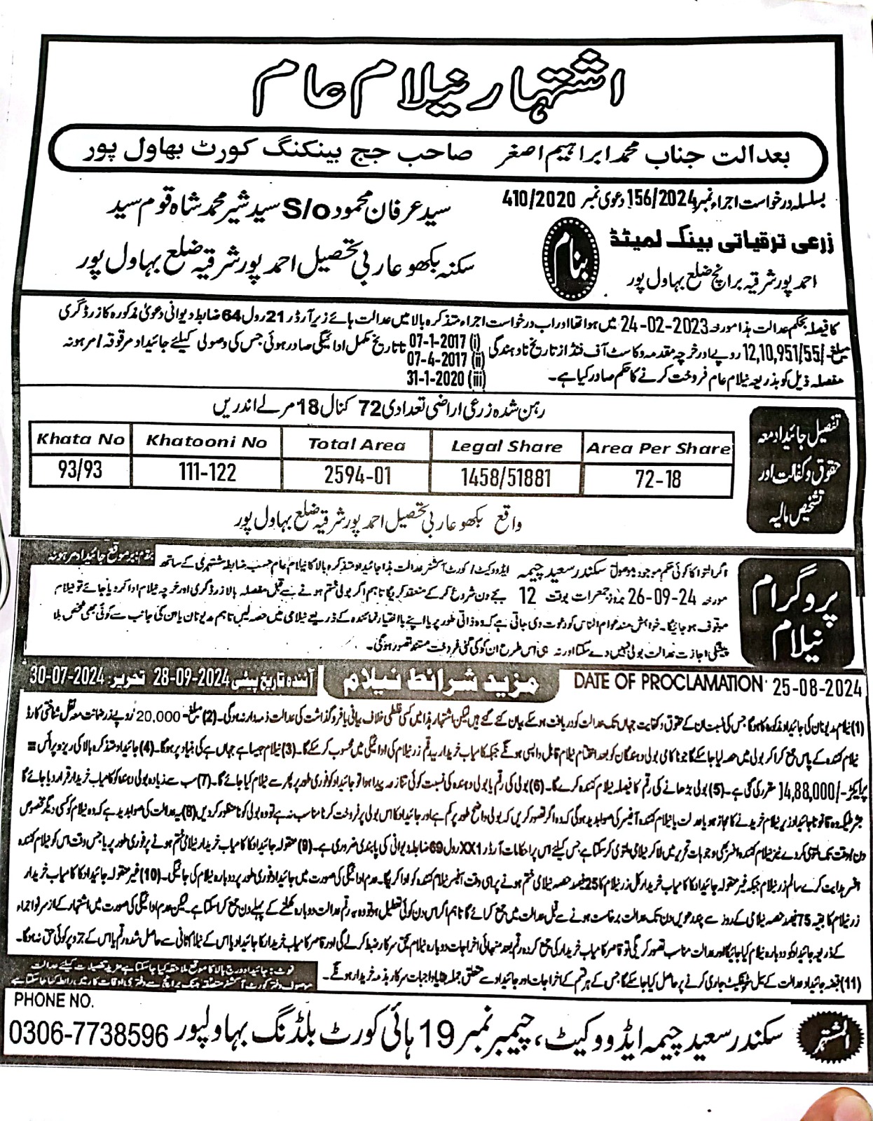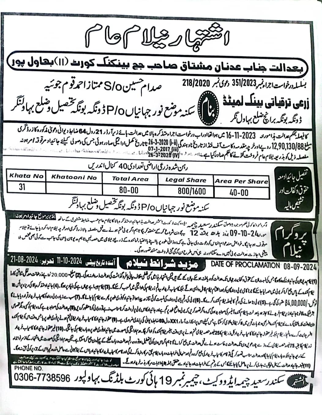 81. ZTBL احمد پور ایسٹ برانچ بمقابلہ سید عرفان محمود ولد سید شبیر حسین، پھانسی نمبر 156/2024 [26-ستمبر-2024، جمعرات 12.00 بجے]