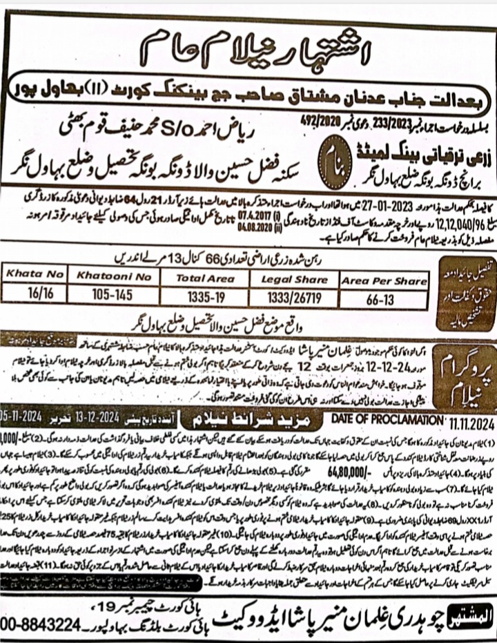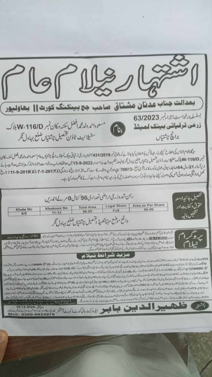 52. ZTBL بہاولنگر برانچ بمقابلہ محمد ساجد ولد محمد جہانگیر، پھانسی نمبر 06/2024 [19-دسمبر-2024، جمعرات 12.00 بجے]