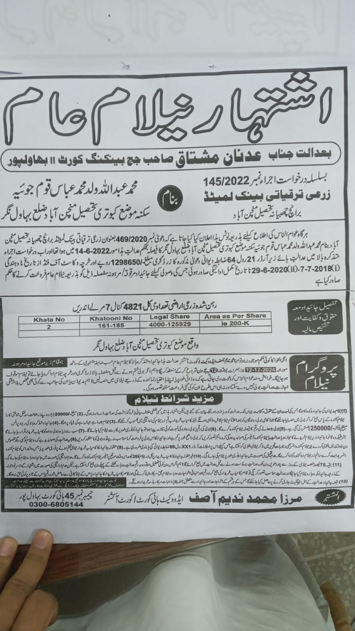 45. ZTBL  ہارون آباد برانچ بمقابلہ محمد عباس عابد ولد علی محمد، پھانسی نمبر 149/2023 [30-جنوری-2025، جمعرات 12.00 بجے]