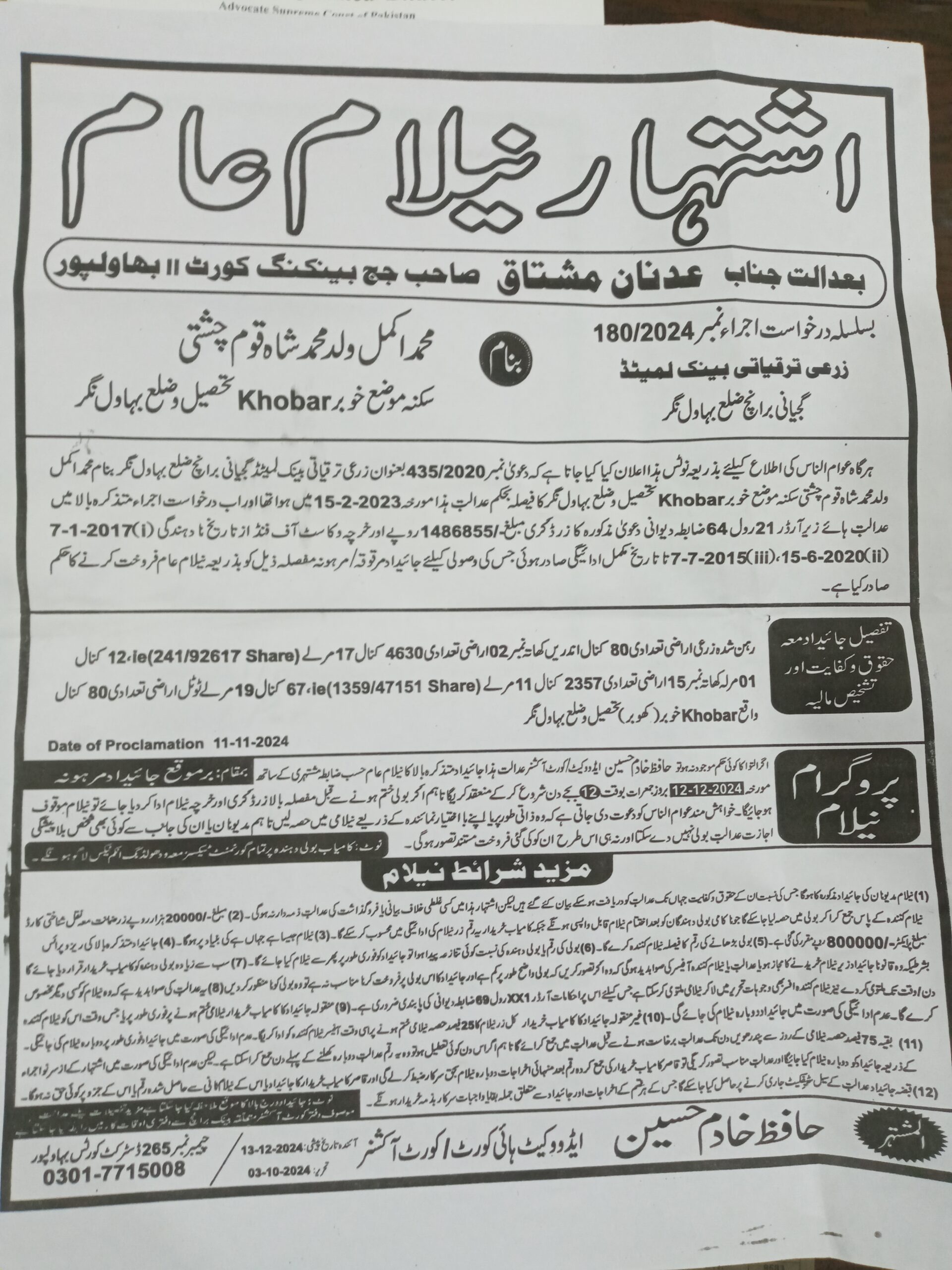 53. ZTBL گاجیانی برانچ بمقابلہ محمد اکمل ولد محمد شاہ، پھانسی نمبر 180/2024 [12-دسمبر-2024، جمعرات 12.00 بجے]