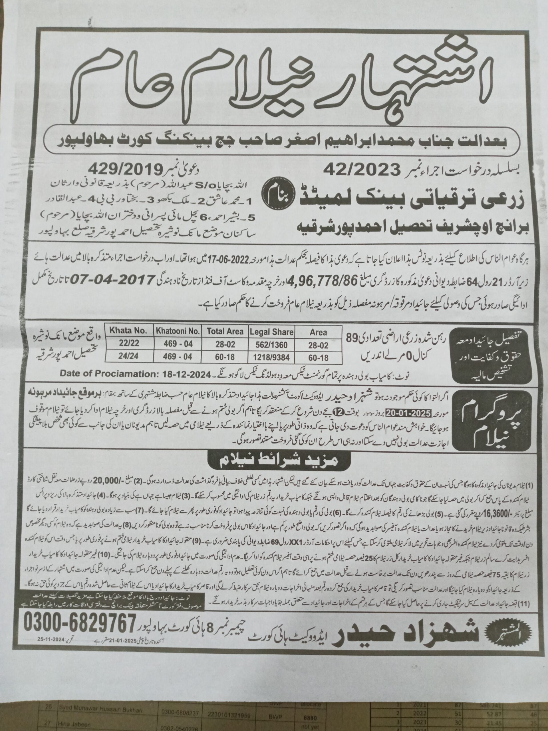 42. ZTBL ڈونگا بونگا برانچ بمقابلہ شوکت علی S/O غلام علی، پھانسی نمبر 92/2024 [28-جنوری-2025, منگل 12.00 PM]