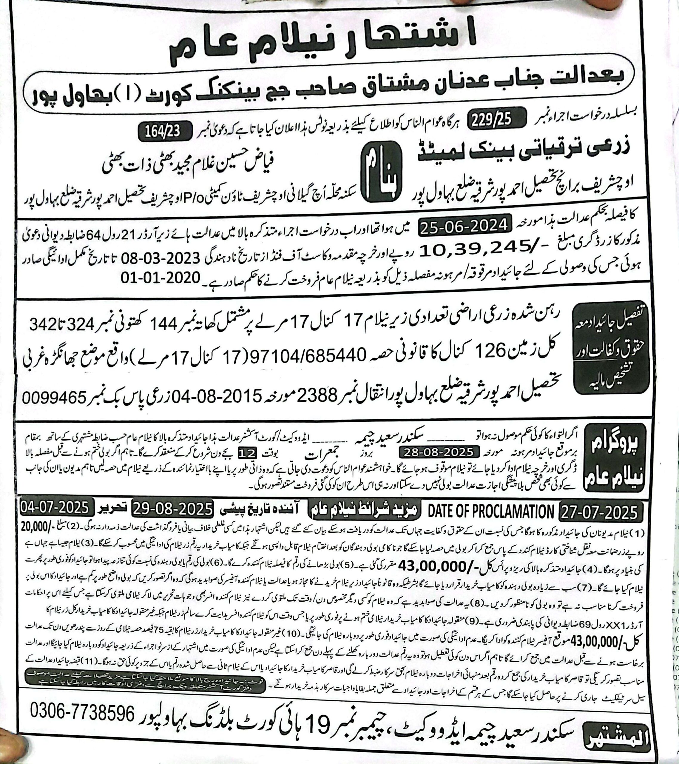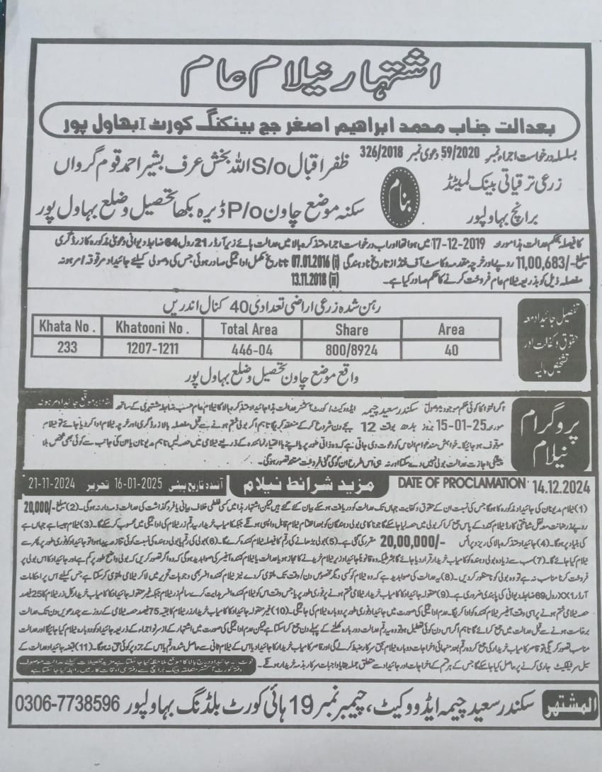 43. ZTBL بہاولپور برانچ بمقابلہ ظفر اقبال ولد اللہ بخش، پھانسی نمبر 59/2020 [15-جنوری-2025، بدھ 12.00 بجے]