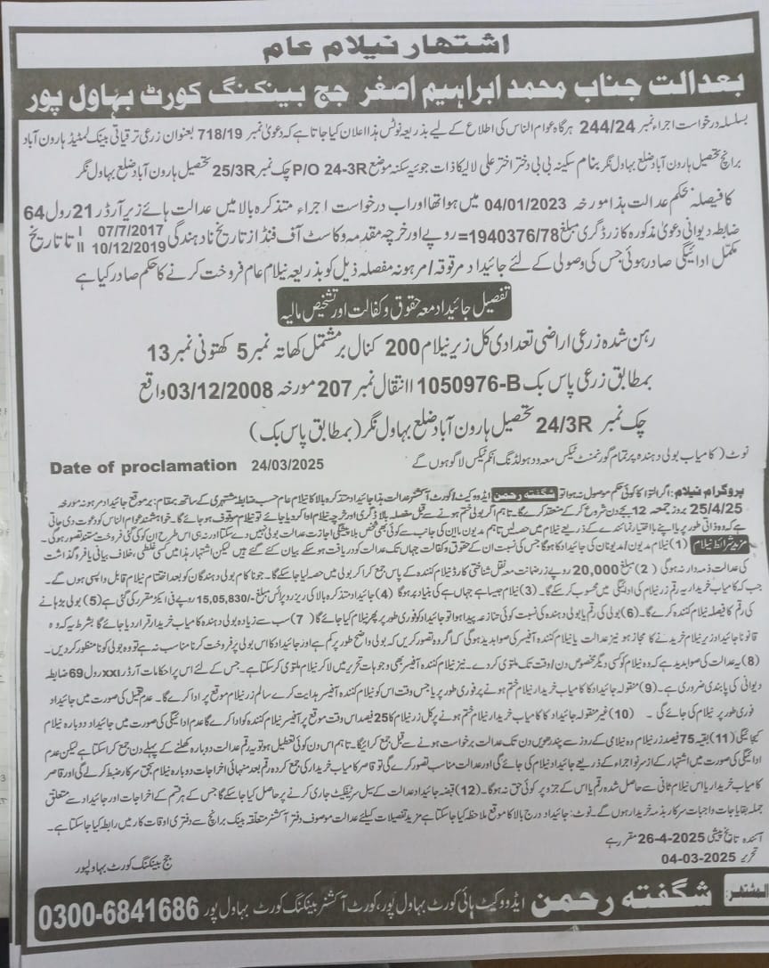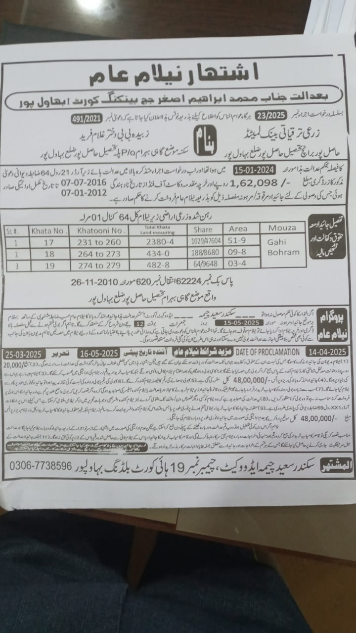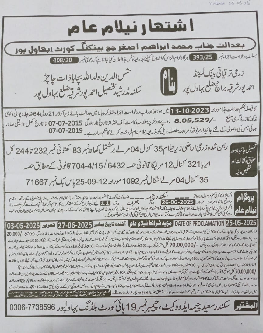 19. ZTBL احمد پور ایسٹ برانچ بمقابلہ شمس الدین ص/اے اللہ بچایا، پھانسی نمبر 393/2025 [26-جون-2025، جمعرات 12.00 بجے]