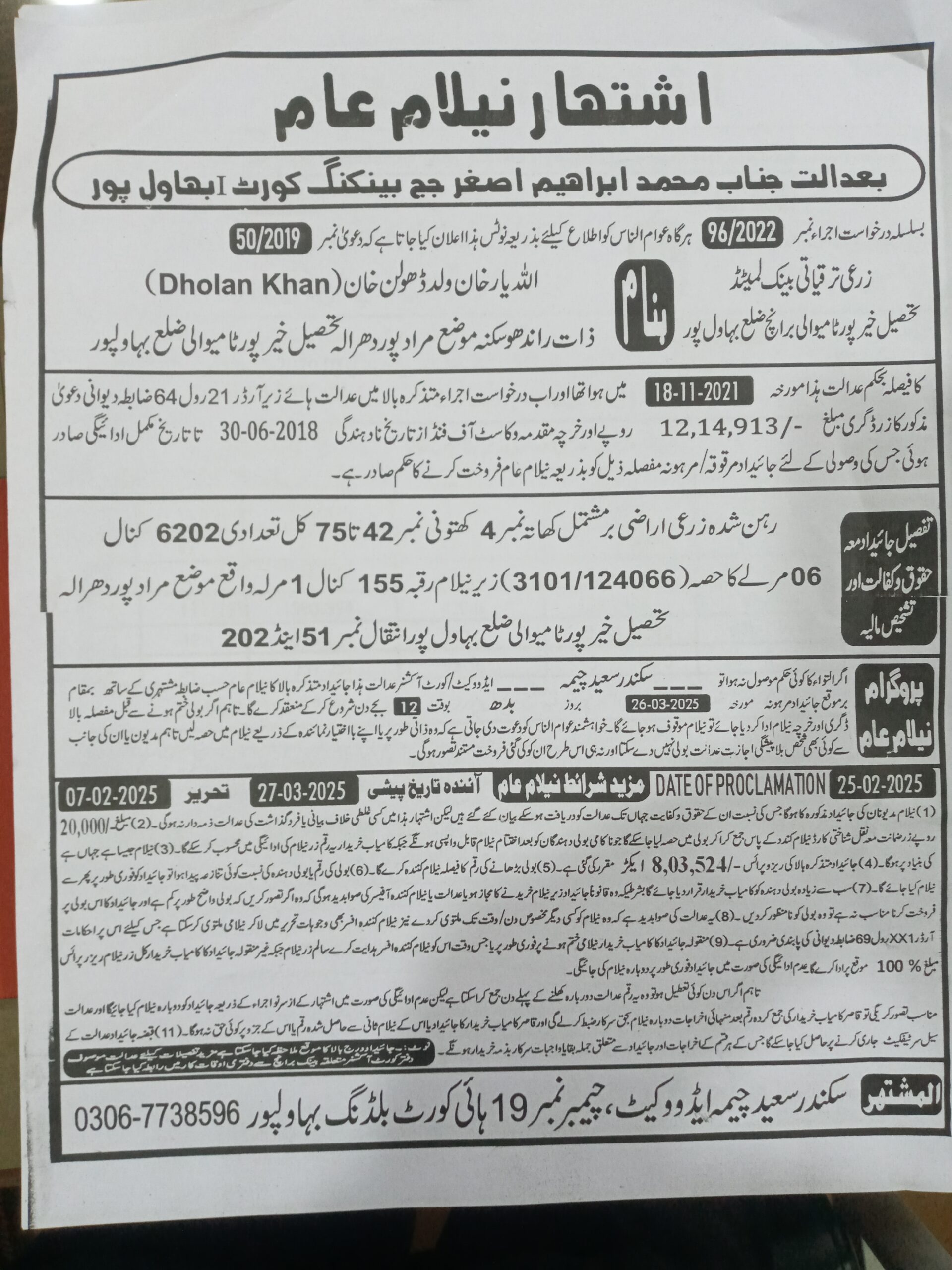 47. ZTBL خانپور کٹورا برانچ بمقابلہ محمد جندواد خان ولد واحد بخش، پھانسی نمبر 31/2022 [19-دسمبر-2024، جمعرات 12.00 بجے]