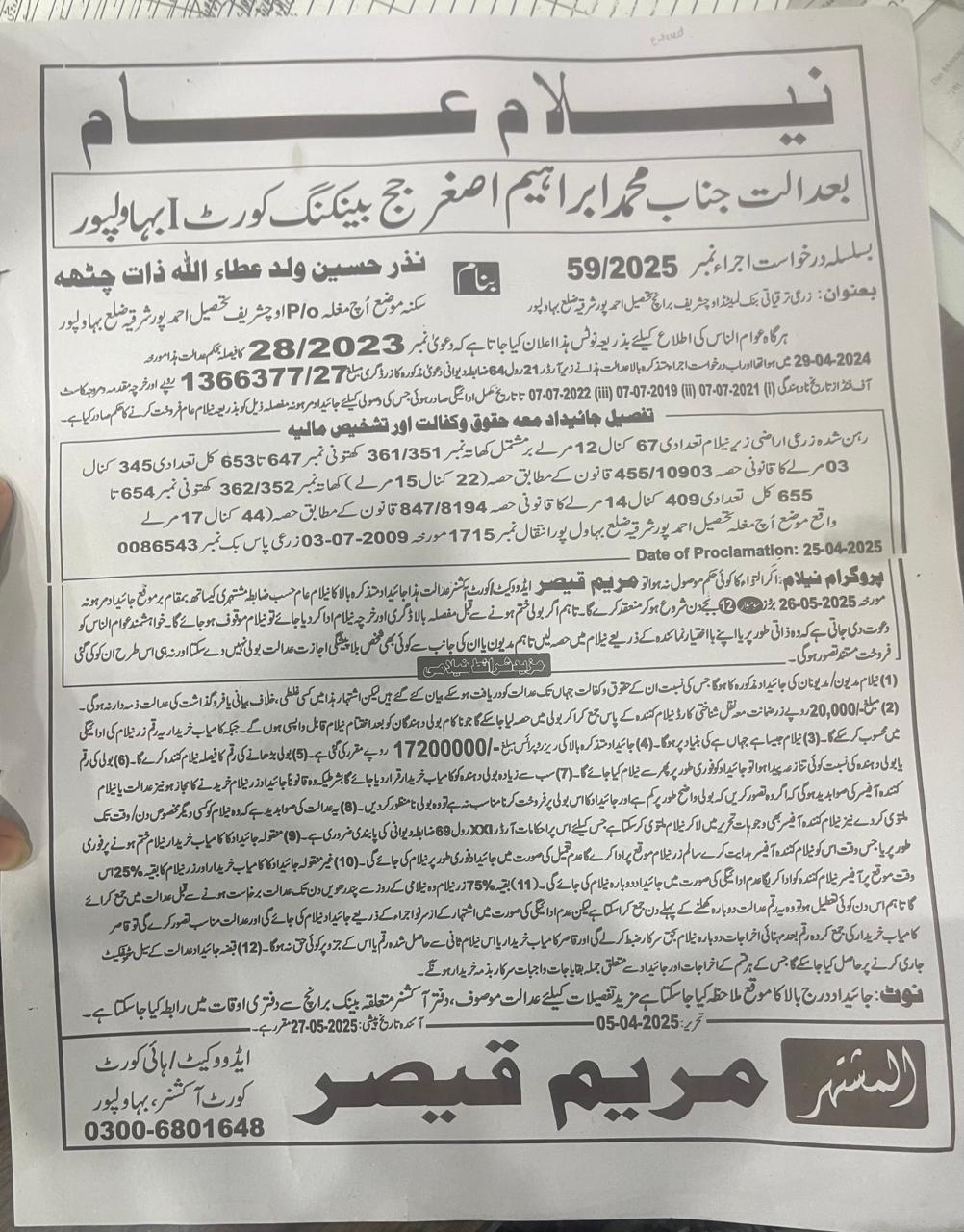 28. ZTBL شریف برانچ بمقابلہ نذیر حسین ولد عطاء اللہ، پھانسی نمبر 59/2025 [26-مئی-2025، پیر 12.00 بجے]