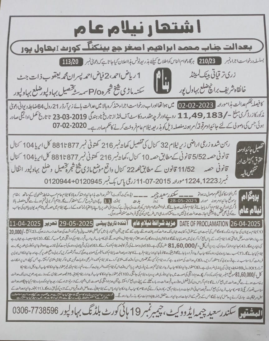30. ZTBL حاصل پور برانچ بمقابلہ زبیدہ بی بی D/O غلام فرید، پھانسی نمبر 23/2025 [15-مئی-2025، جمعرات 12.00 بجے]
