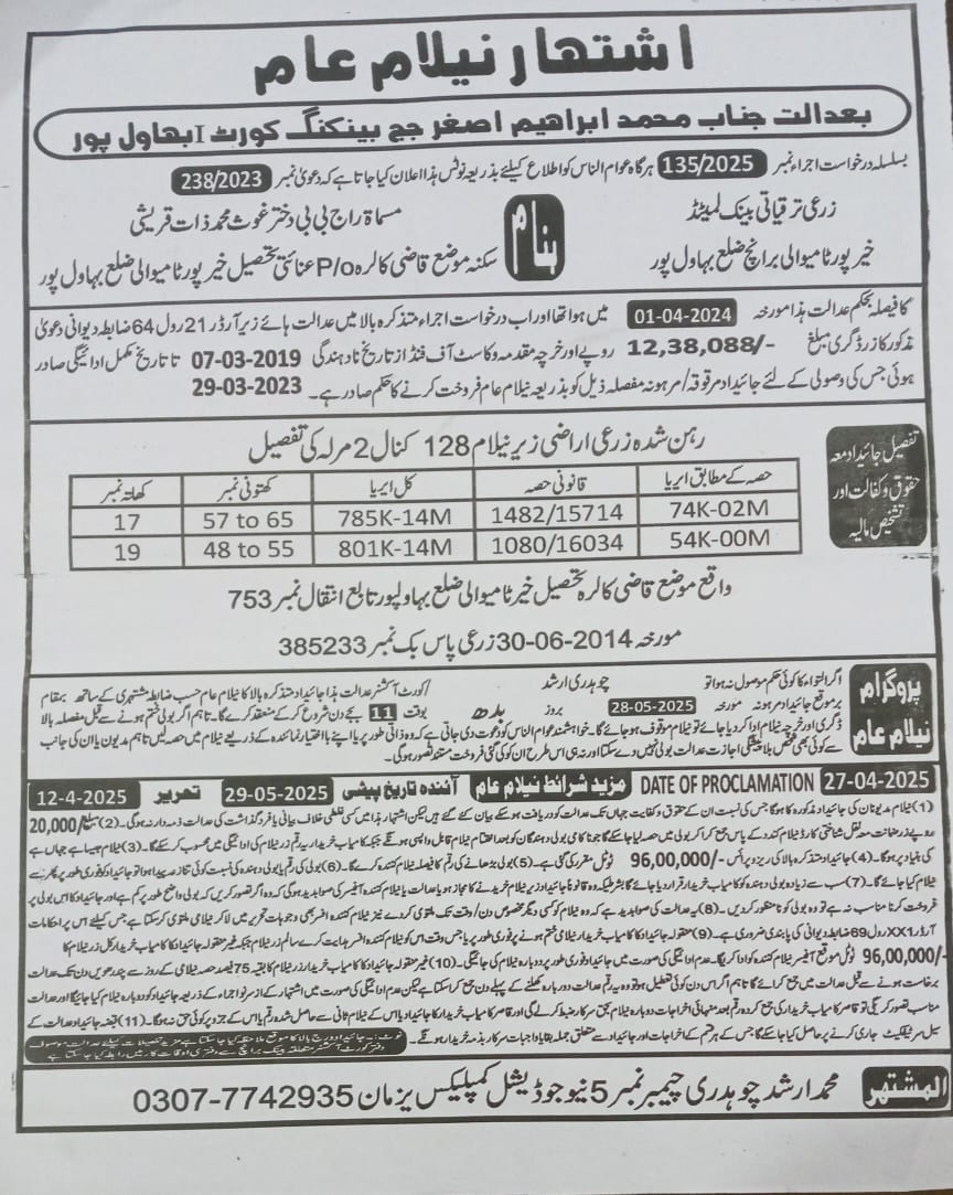 135. ZTBL احمد پور ایسٹ برانچ بمقابلہ محمد ارشد ولد واحد بخش[17 مئی 2024]