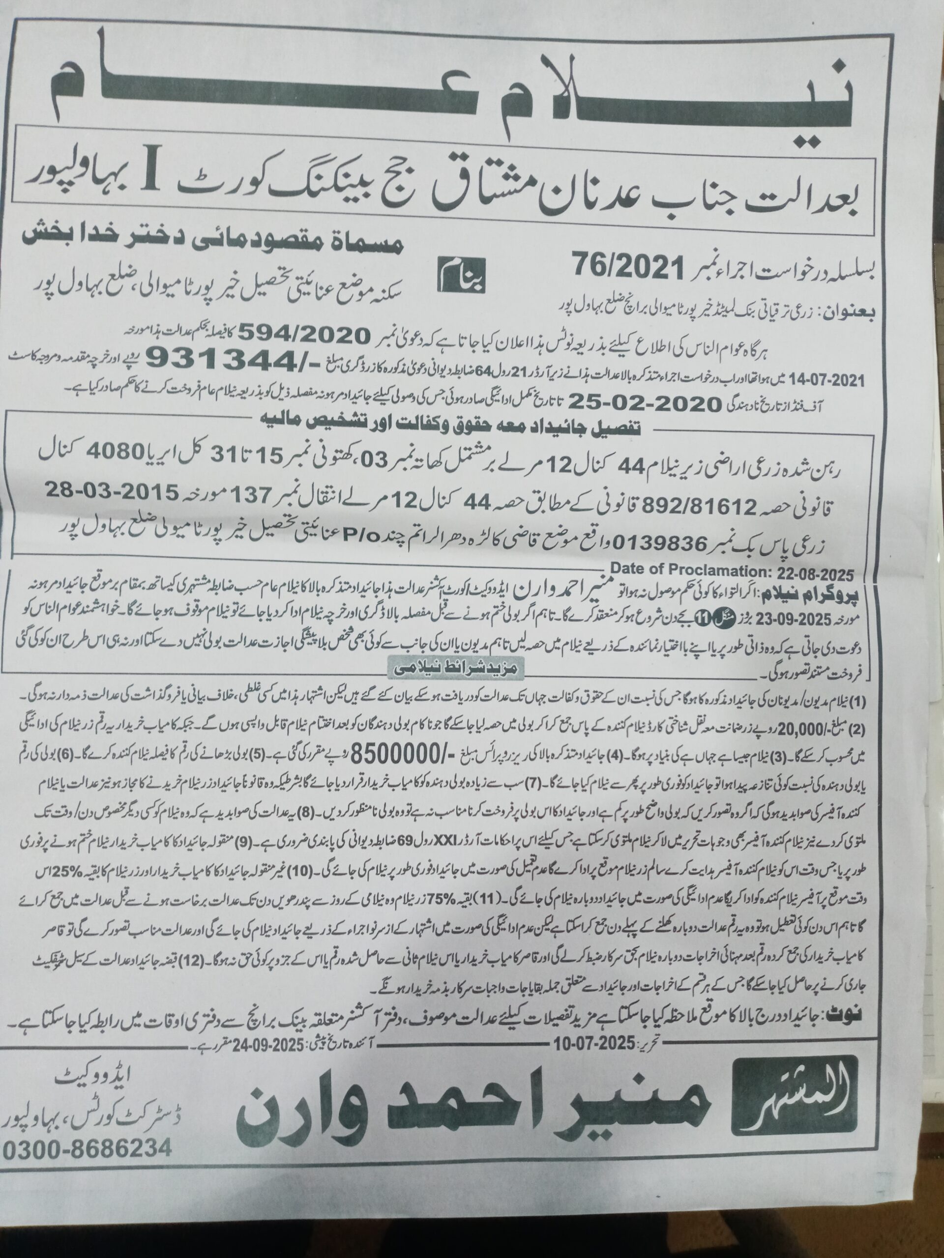 15. ZTBL خیرپور تامیوالی برانچ بمقابلہ محترمہ مقصود مائی D/O خدا بخش، پھانسی نمبر 76/2021 [23-ستمبر-2025، منگل صبح 11.00 بجے]
