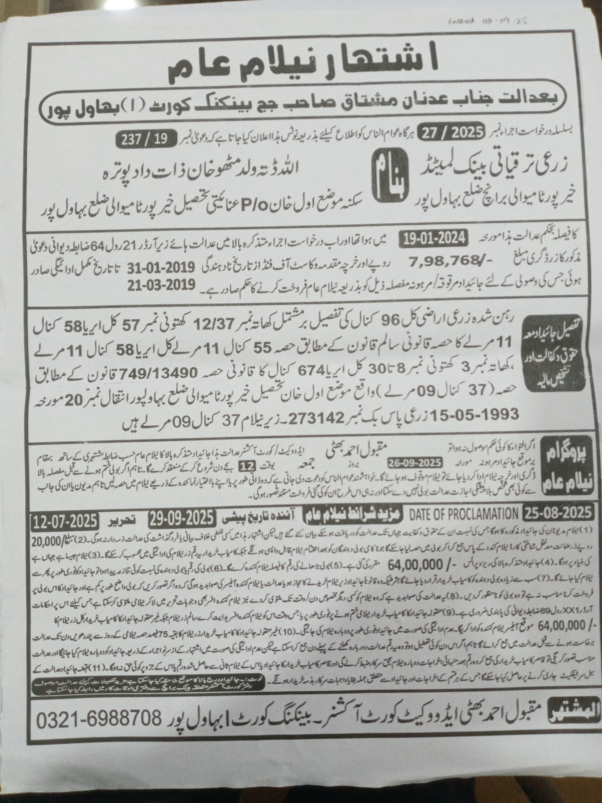 25. ZTBL احمد پور ایسٹ برانچ بمقابلہ اللہ دتہ ولد ملک حاجی، پھانسی نمبر۔ 38/2025 [21-مئی-2025, بدھ AT 02.00 PM]