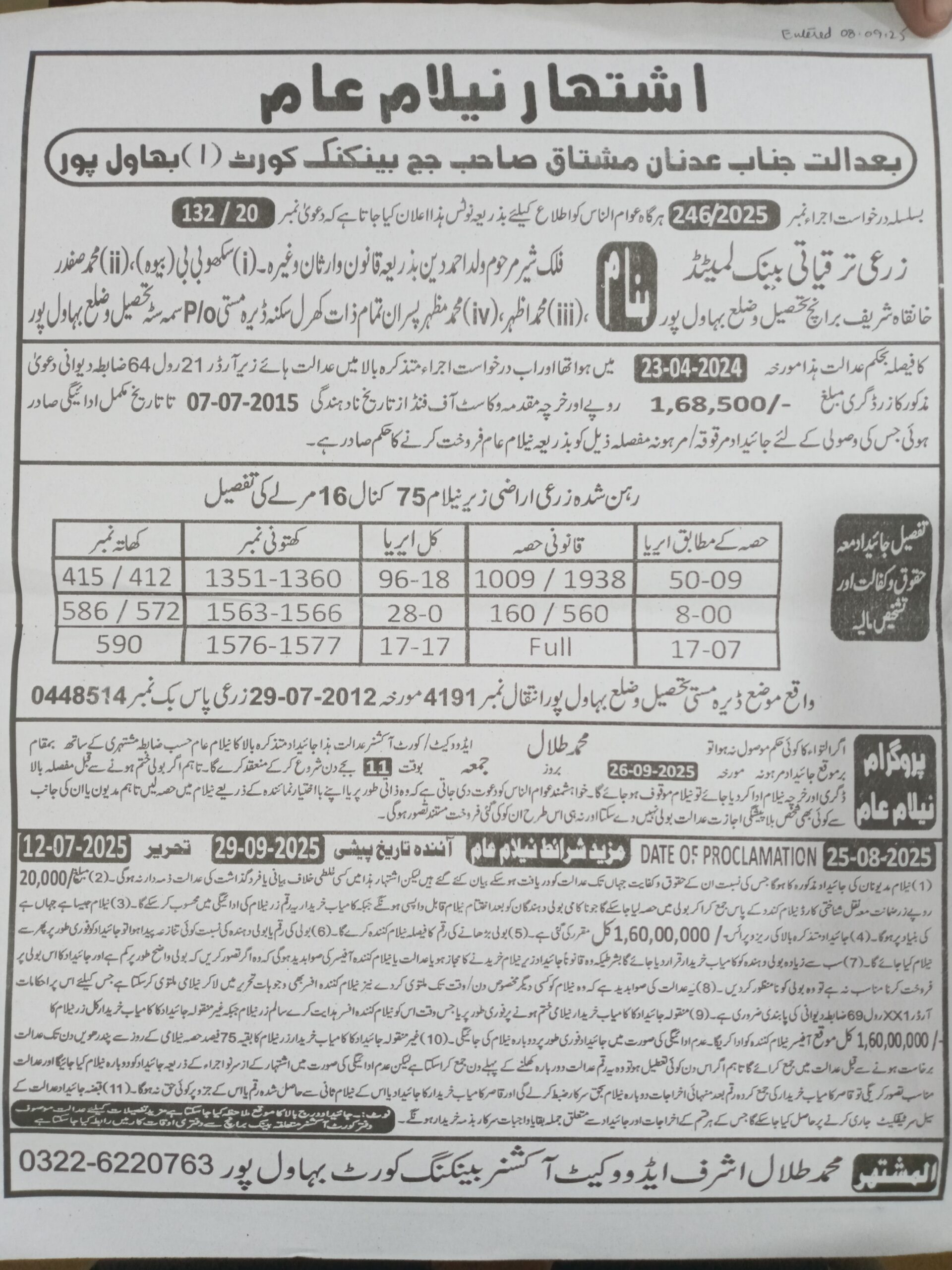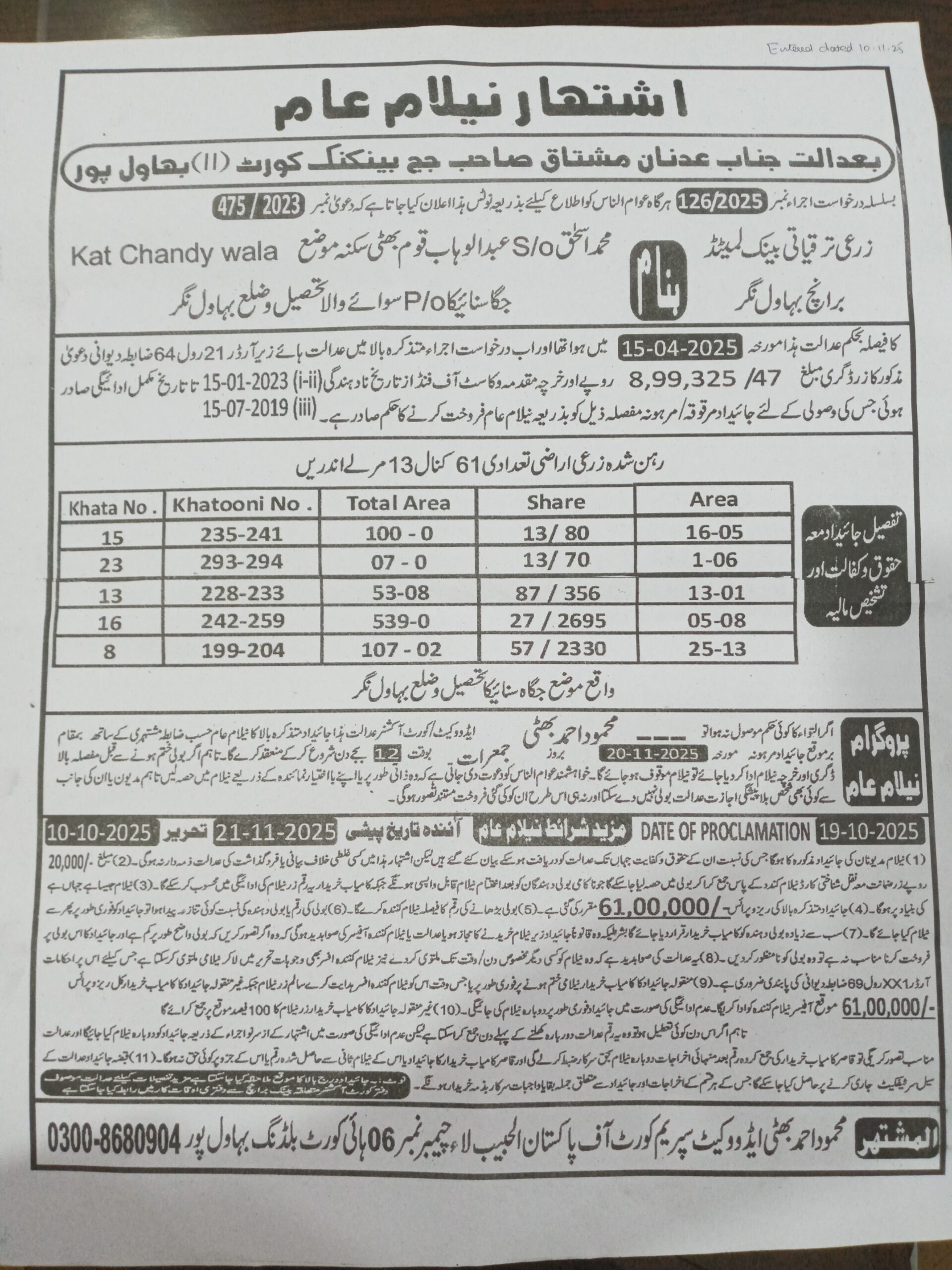 8. ZTBL بہاولنگر برانچ بمقابلہ محمد اسحاق ولد عبدالوہاب، پھانسی نمبر 126/2025 [20-نومبر-2025، جمعرات 12.00 بجے]